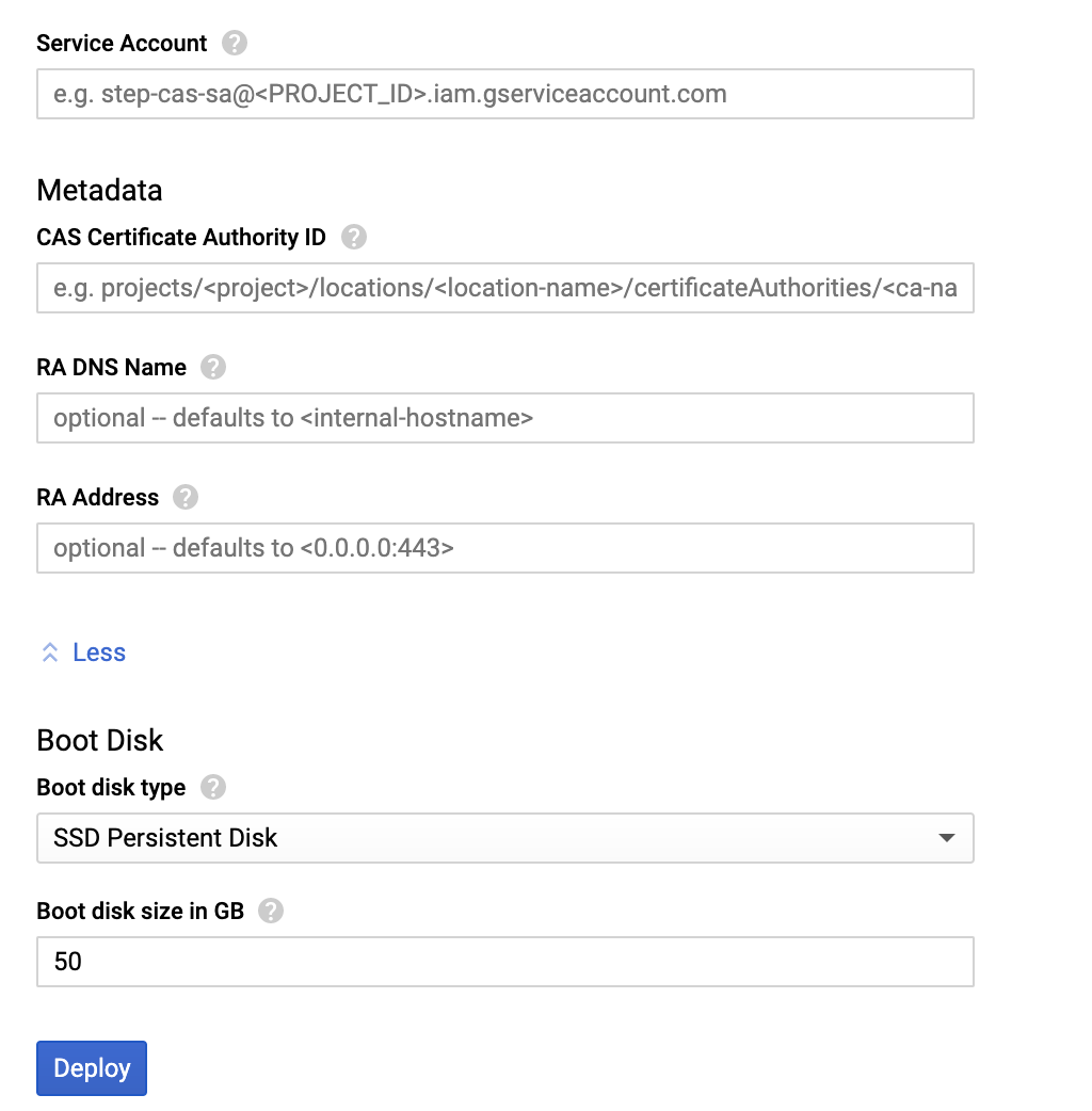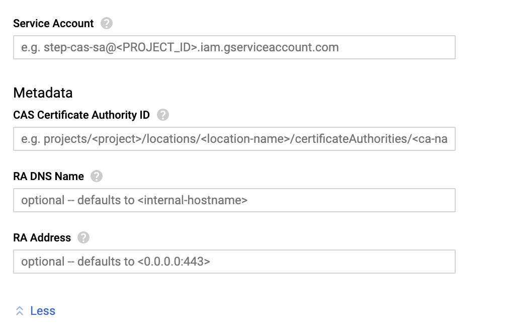 • RA DNS Name: use this field to configure a permanent DNS name for your ACME RA. By default, this value will be the internal hostname of the instance. Hostnames are permanent within GCP so this value will not change across host restarts.