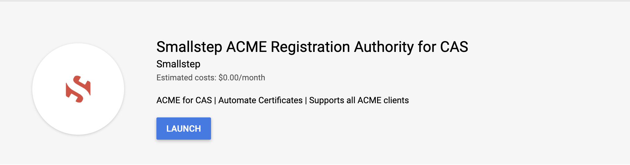 1. Select "Smallstep ACME Registration Authority for CAS" from GCP marketplace and hit the Launch button.