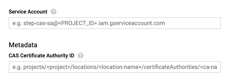 • Service Account: email address of the service account generated in the previous step. This value should be equivalent to step-cas-sa@<PROJECT_ID>.iam.gserviceaccount.com.