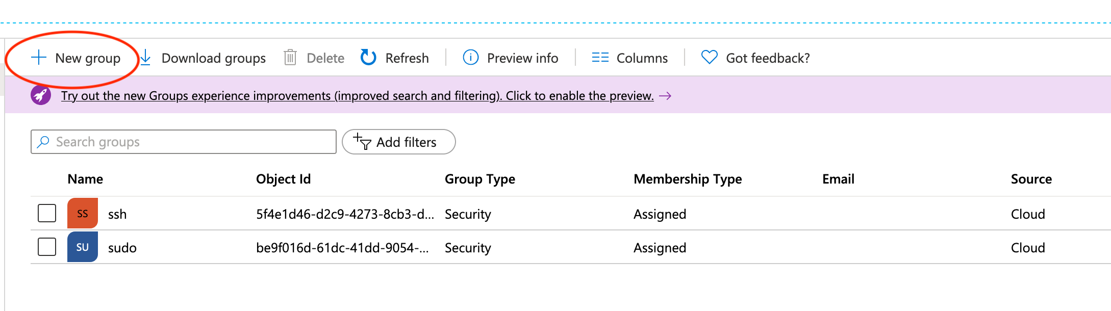 You'll grant access to your hosts via Active Directory Groups. If you don't already have groups set up, you'll want to create a group for each kind of user access to your servers. For example, you might have a group for ssh users, and one for sudo users.